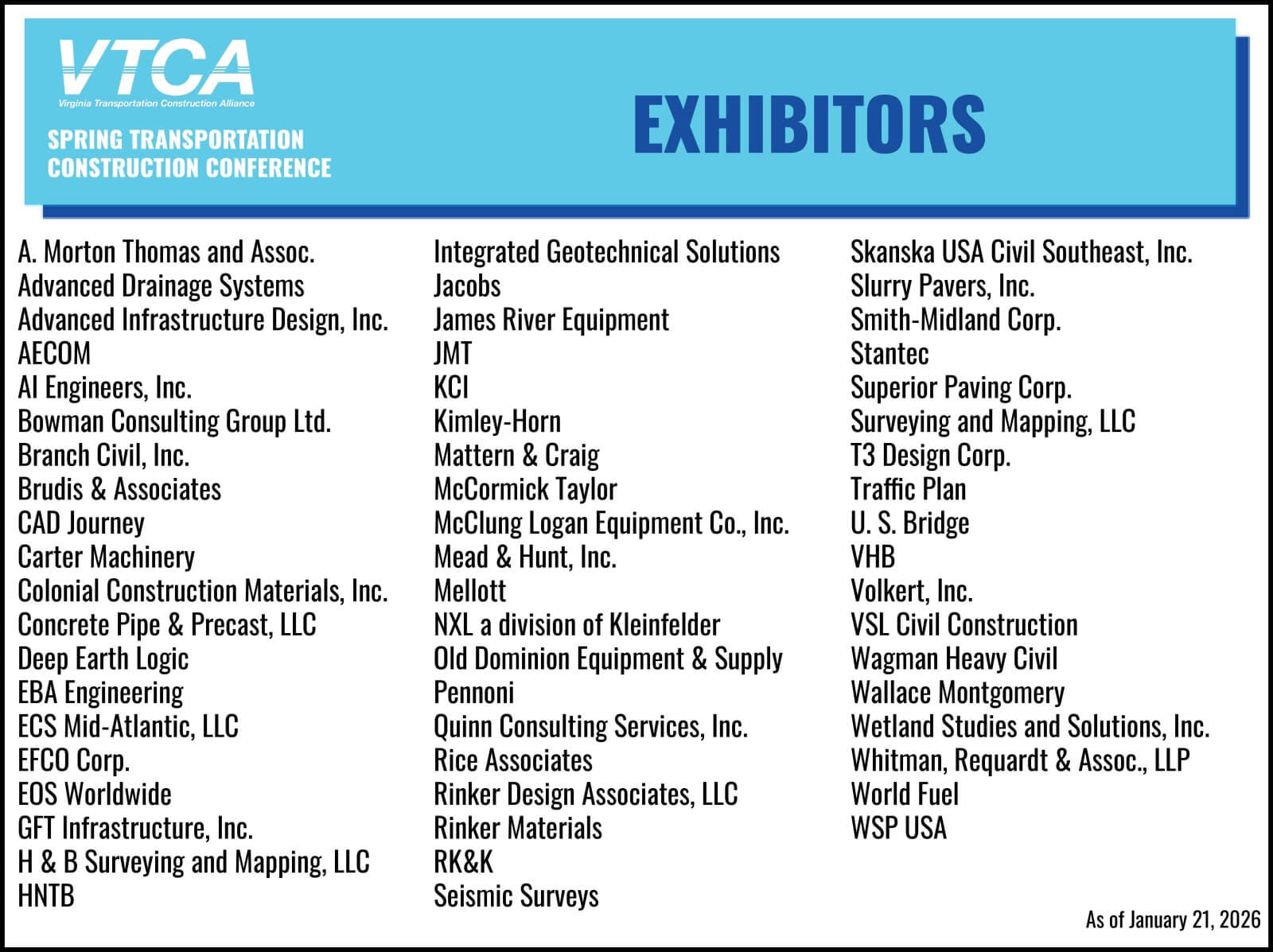 VTCA members have priority choice for exhibit space through February 3, 2026. After that date, the remaining exhibit space will be offered to non-members. Non-members are encouraged to email Stephanie Rusnak to be placed on a waiting list until February 3 when they will be notified of the remaining booth space.